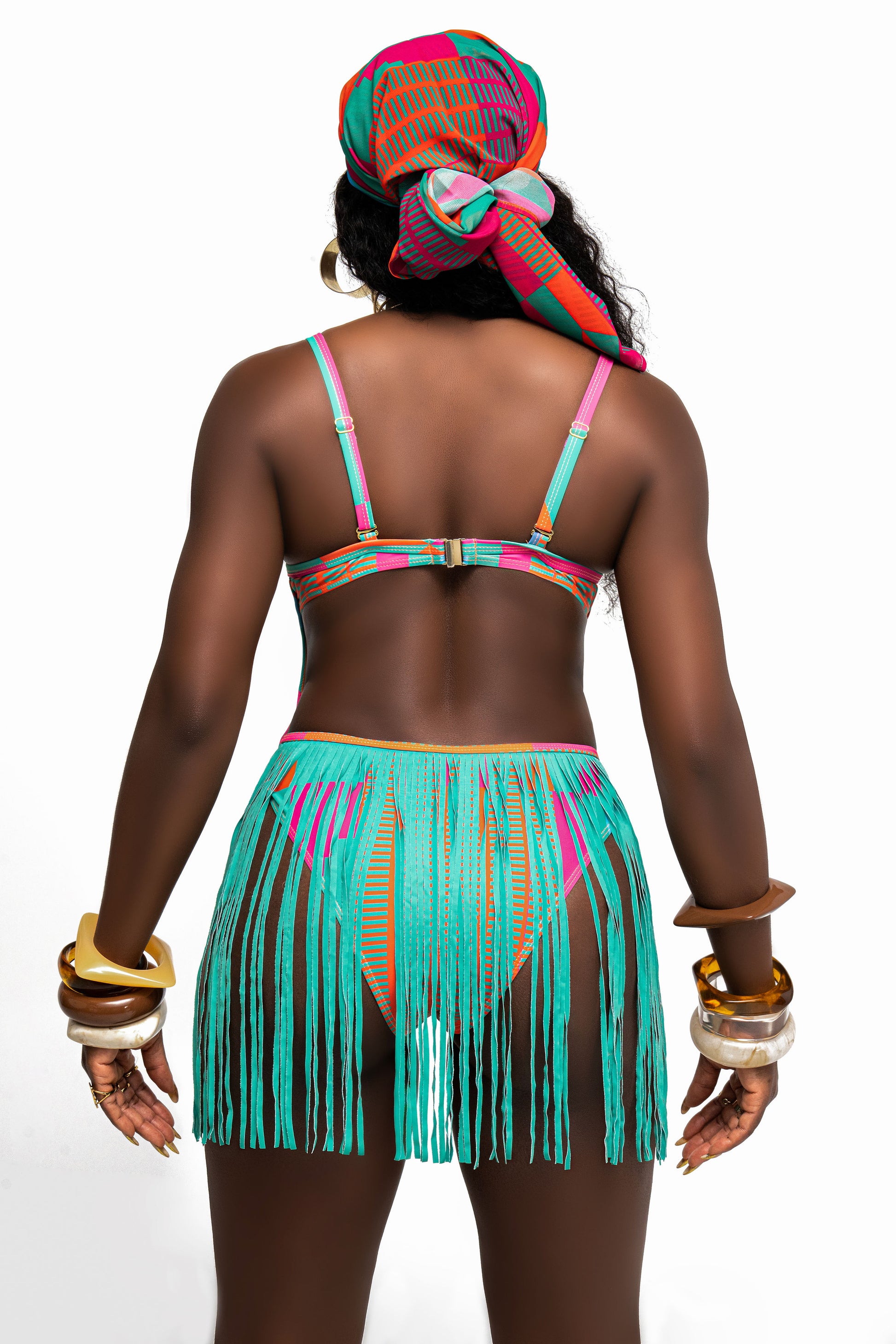 Baoule is a colorful one piece boasting molded cups, adjustable straps, featuring flirty fringe around the back of the waist, and gold clasp closures to finish it off.